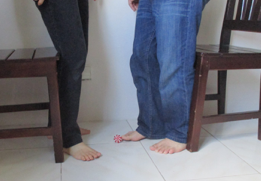 Players sit in a circle, and while “it” leaves the room, one person gets a ball. When “it” returns to the room, she tries to guess who has the ball. Traditionally the button was hidden in one hand, and both hands were held up for inspection. The ball is pretty big, and at this age, can’t be hidden in a hand. So hidden in a pocket or under a knee is just as good.