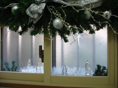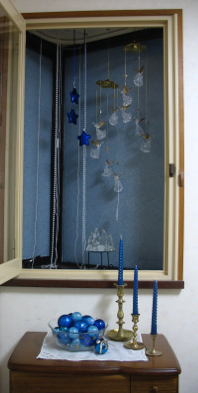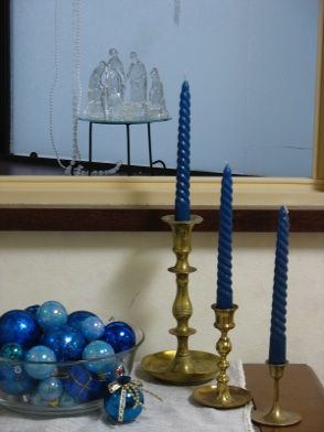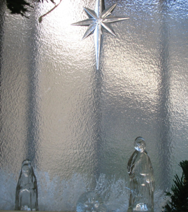 This clear glass nativity set is combined with acrylic angels spiraling above them. In addition, the blue hanging stars and blue candles and bowl of blue balls all combine to make a small nativity set into a much larger arrangement. The nativity set is on a stand so it can be seen above the double window frame. A mirror under the set reflects even more light through the glass figures.