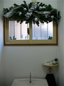 The same clear glass nativity set looks entirely different in a small bathroom window. This time the figures are lined up on the window sill with a white tinsel garland to add sparkle.