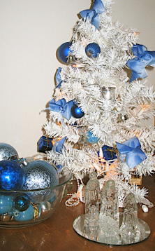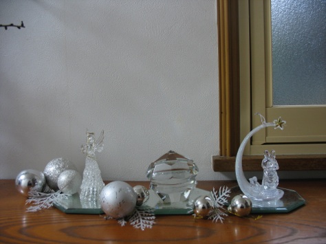White mirror tiles combine with a variety of glass and silver objects, including an angel on the left, and a nativity ornament on the right. The sparkling white and silver objects, imitating ice and snow, and continue the color theme in the rest of the decorations in the foyer.