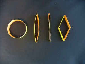 If all that sounds too complicated, try this--cut all 4 strips the same length--the width of the paper. Then hold two strips together on the ends. Pull on the middle one to make it shorter, and cut off the excess. Glue or staple the ends.