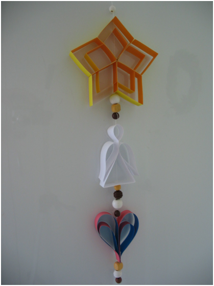 String the decorations together with needle and thread. Add interest by stringing beads between the ornaments. Keep the beads from crushing the paper ornaments by running the thread through the hole in the bead twice (one strand will stay on the outside of the bead.) This will still enable you to move the beads up and down, but keep the beads from sliding down on top of the paper ornaments. Some dollar stores (100 yen stores) sell wooden or plastic beads, but if you can’t find these, buy a necklace or bracelet, cut it apart and use the beads. You can also roll paper into beads by rolling narrow triangles of paper, and the narrow end of the triangle will make the middle of the bead fatter than the ends.