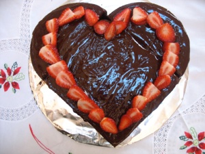 You don’t have to have a heart shaped pan to make a heart shaped cake. Just make one round layer and one square layer. Cut the round cake in half and put it on two sides of the square cake to form a heart. For an incredible topping, make ganache (heat 2/3 cup heavy cream, turn off the heat and mix in 2/3 cup chopped chocolate until it melts. Pour over top of the cake.) Honestly, we could not stop eating it!! You will need a large platter, or cover a piece of cardboard with tinfoil to put the cake on. If you prefer the cake to be red, top with cherry pie filling or make a thick strawberry sauce with frozen strawberries, sugar, and corn starch.