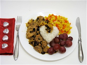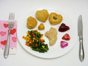 Cookie cutters can also be used to cut biscuits--these are the kind you get out of a cardboard tube in the dairy section of the grocery store. The chicken and jam are a bit more subtle--hearts shaped by hand. You can add more red with foiled covered chocolate hearts and napkins.