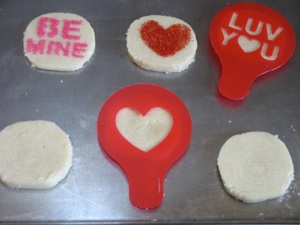 Store-bought cookie dough can be hard to manage once it comes to room temperature. To combat this, quickly slice the dough, and put it on the cookie sheet, then put the cookie sheet back in the refrigerator to cool. When you take the cookie sheet back out, press the heart cutter into each circle of dough, and scrape away the excess dough before removing the cutter. If you try to move the heart shaped cookie when it is warm, it will stretch out of shape, or tear. This way you don’t have to move the cookie once it is cut. If you have the time to make the dough from scratch, home made dough is way easier to work with, and tastes so much better!