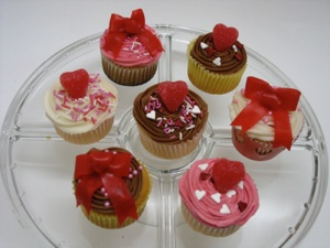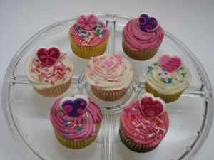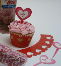 Another way to have a stand-up style decoration is to buy paper picks. Or you can make your own by sticking two symmetrical heart stickers onto 2 sides of a toothpick. Cuffs are cute ways to dress up cupcakes, too, but most are over priced, in my opinion. These were sold together in packs of 6 in the Target dollar section.