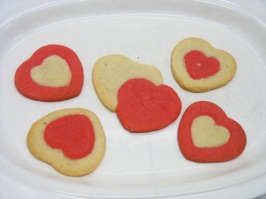 To make two-toned cookies, add food color to some of the cookie dough, then roll out and cut the hearts shapes. Use a smaller cutter to cut out smaller hearts from the middle, then swap middles of two different colors.