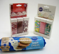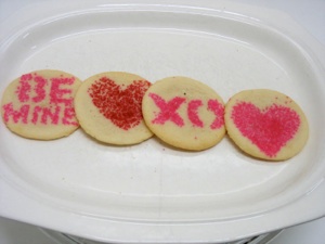 Use stencils to add decorations to the cookies by sprinkling with colored sugar before baking them. These were sold in the dollar section of Target.