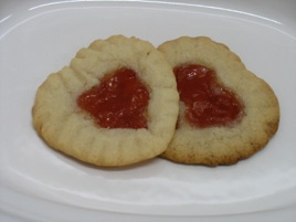 Cut out two hearts, and cut a smaller heart “window” in one of them. Put a bit of jam on the solid heart, then put the cookie with the “window” on top, and press together with a fork. An easier option is to cut roll out the dough a little thicker, and press your thumbs into the middle to form a heart indentation. Fill with jam and bake.