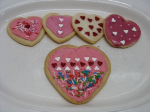 Other kinds of candy hearts work just as well. Sprinkles come in so many shapes, now, that you can have lot of variety. To make cute little bows, buy red “Fruit by the Foot.” Cut off 3 short strips and form into bows--make one into a loop to form the bow, make a smaller loop for the knot in the middle, then notch the 2 ends that hang down.