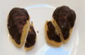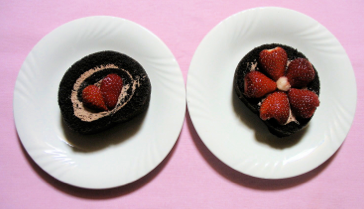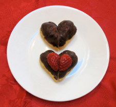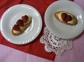 Cut the ends off of two eclairs diagonally, and assemble them as a heart. Cut a strawberry in half and put the two halves next to each other, cut side down, to form a red heart on top of the eclair heart. The strawberry will look a bit more like a heart of you trim the sides that are next to each other in the middle.