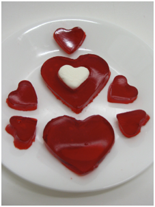 You can buy heart shaped molds, or just make the jello with half the water called for, and cut the stiffer jello (called “jigglers”) with a heart shaped cookie cutter. I find it easier to scrape strips of jello out of the pan with a thin spatula, then cut it with the cookie cutters once it is out of the pan. Otherwise, the jello tears or stretches out of shape.