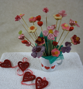 Make or buy cookies that have a hole in the middle. Push them onto a skewer with gummy candy or gumdrops above and below the cookie to hold it in place. Tape foil wrapped chocolate hearts to some skewers, too. Heart shaped gummy candy can make more flowers--just “glue” them onto cookies, or clear plastic (such as the lid of a potato chip can, or margarine tub.) The “glue” is icing, of course! Make red flowers by “gluing” red m’n’m’s to some of the flower cookies. If you just stick the skewers into the cup, they will all flop over because they are top heavy. So poke them into an apple or potato to make each one stay where you want it, and drop that into a cup or box to make it look pretty. If you can’t bring yourself to waste a vegetable, poke it into oasis--it needs to be a tight fit in the container, or it will tip over since it is so light.
