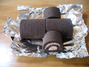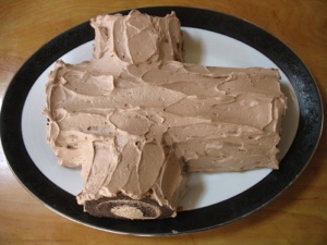 Cut one cake in half for the cross pieces and put on either side of the other two roll cakes. Slide strips of tin foil 1-2 cm. under the cake to keep the plate clean.