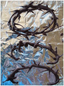 Melt chocolate and put it in a decorator bag. Cut off the tip and squeeze a crown of thorn shape onto a sheet of tinfoil. Put it in the refrigerator to harden. Peel it off the tinfoil and arrange it on the cake.