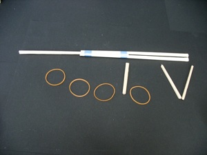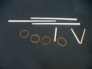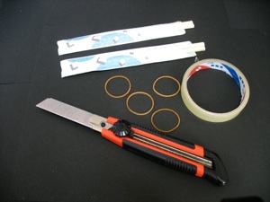 You will need 2 pairs of disposable chopsticks, 4 rubber bands, scotch tape, and a box cutter or hand saw.