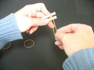 Fasten the handle pieces together by placing one rubber band around one short piece.