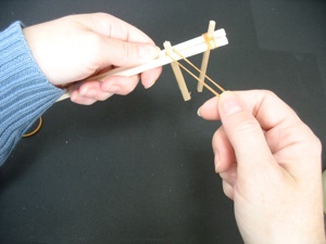 Slide the second handle piece between the two open sticks, and fasten it in place with a rubber band as explained for the first one.