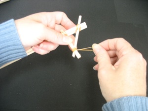 Wrap it around and around the two chopsticks, and end by stretching it back over the top of the short piece.
