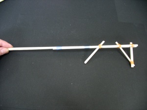Make the handle by sliding one short piece between the two chopsticks. Place one rubber band around the top of the short piece.