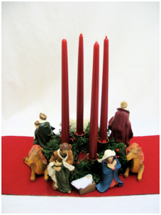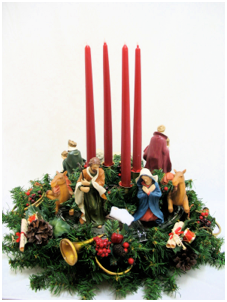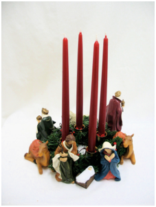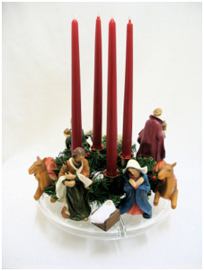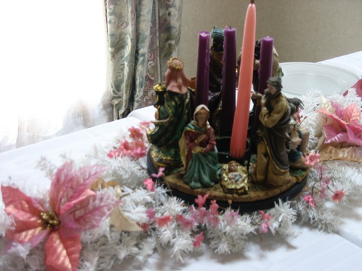 I ordered the advent candle holder in the photo on the left that depicts the whole Christmas story from an on-line company. Then I layered it on top of 2 white miniature Christmas trees turned sideways and added pink poinsettias and small flowers for a spectacular centerpiece (trees and flowers from hundred yen stores). If you want to make one similar to this, you can line up 4 candle holders and loose figures on a dollar store lazy susan, or pedestal cake plate. Garnish with greenery of your choice (see more photos below.)