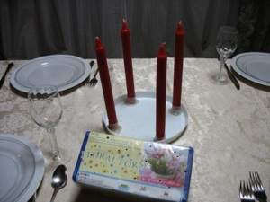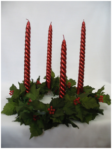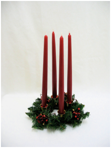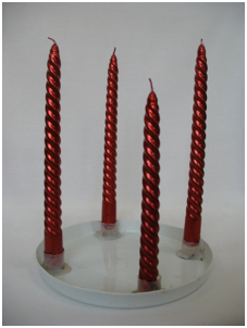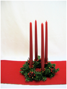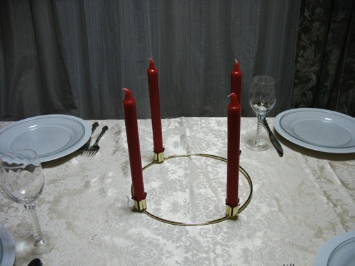 Hint: When the candles burn very short, the combination of artificial wreath and flame can create a fire hazard. To avoid this problem, when the first candle gets very short, I take out the shortest candle, add a new one, and continue burning the next shortest candle as if it were the shortest.