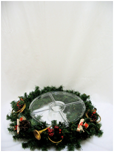 Arrange nativity set figures around the advent wreath to keep the true meaning of Christmas central in your home. If you plan to use it on your dinner table, put everything on a lazy susan--this will allow your children to spin is around to see all the figures, and it also makes it easy to move off the table to wipe off the table, or change the tablecloth. You can put them on a tray or pedestal cake plate instead.