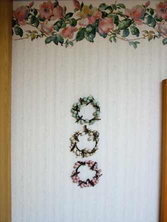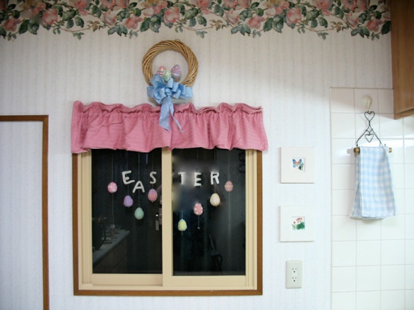 The same dough eggs can be added to a wreath, hung in a window, or hung from a dowel on a wall. Hanging real eggs can be scary because one wrong move, and all that hard work ends up in tiny pieces. I don’t think I am especially clumsy, but I do tend to drop them several times before I get them all hung, so I only use non-breakable eggs for hanging! My daughter made the letters spelling “EASTER” when she was in elementary school, so your children can help you with this decoration, too. Hint: Eggs don’t matter if they spin, but letters do, so be sure to run thread through 2 places, or it will drive you crazy trying to get them to all face the right direction. Or, make sure they hang against the wall or window so they can’t spin. The small egg wreaths on the right were purchased at a hundred yen store, but could easily be made for the same modeling clay such as Hearty. The eggs on these wreaths are interspersed with little bundles of twigs.