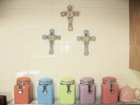 These ceramic crosses, purchased at a 100 yen store, echo the colors of the containers below them. This triplet fills the space better than a single cross would. If you can’t find inexpensive crosses, make your own out of wood, cardboard, felt, or air drying clay such as Hearty, sold in craft stores. Paint them and varnish them and they will look just as good as these. Just remember, crosses have no power. They are only decorations that remind us of the love that God has for us to provide a way of salvation.