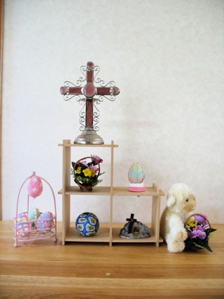 Small nick-nack shelves allow you to display a number of small objects in an interesting way--a great way to display those dollar store finds! Even though you probably won’t find these exact same items, you can display what ever you can find--crosses, sheep, candles, small arrangements of flowers, and your own decorated Easter eggs. You can blow the contents out of real eggs, and decorate them, or you can make them of a modeling clay such as Hearty (available at craft stores.) The nice thing about fake ones is that they won’t break--your son can bounce them off the wall or ceiling, and they will still be good as new. If you don’t have room for a small shelf on your counter or on a window ledge, then buy a shelf that hangs on the wall.