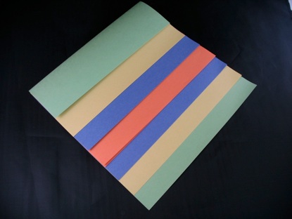 To make a layered Father’s Day card, stack different colors of paper on top of each other (there are 4 sheets shown here.) Spread them out so there is about an inch (2-3 cm.) of each color showing for each layer.