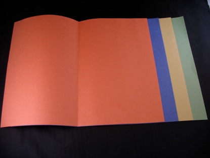 Fold the whole stack of papers so that the layers continue to staircase at the same rate (the middle sheet {orange} is folded in half, so it only shows once.)
