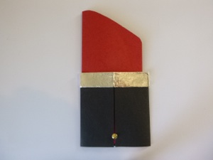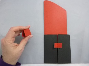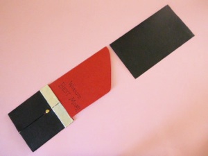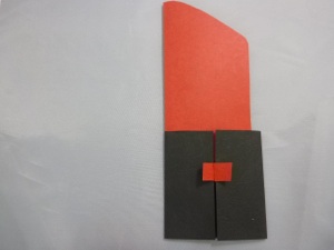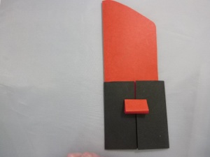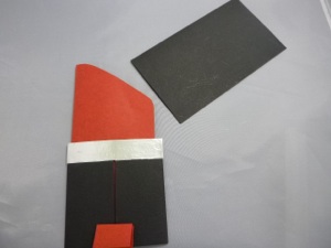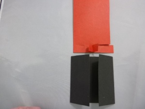 4. Before the glue dries, slide the red lipstick shape into the black base to make sure the 2 small folded pieces are in the right place. Reposition if necessary. The top flaps of the small red pieces should be on the outside of the black base.