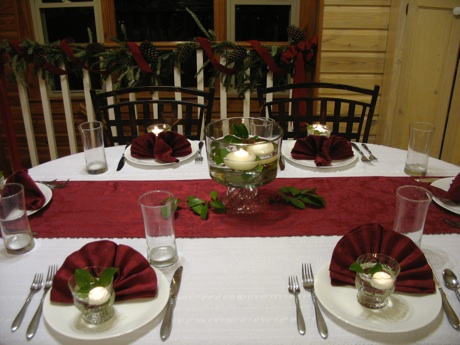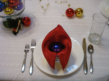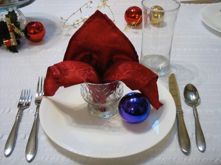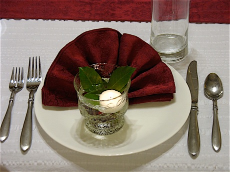 Fold a napkin in half to form a triangle, then in half again to form a smaller triangle. If you use a paper napkin, open to it’s full size, then proceed as above. Lay the triangle over a short glass or dessert cup. Press a Christmas ball (or Easter egg) into the middle. Pull the two side points toward the front.