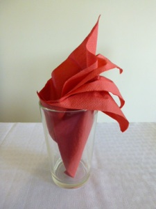Fold a napkin in half to form a triangle. If it is a large napkin, fold it in half again to form a smaller a triangle. (If it is a paper napkin, unfold to it’s full size, and fold into a triangle.) Twist both side points, and put the napkin into a short glass or dessert cup.