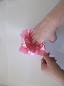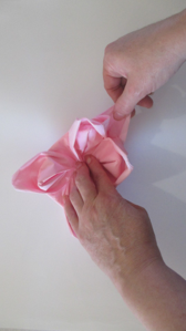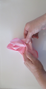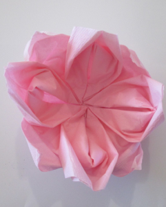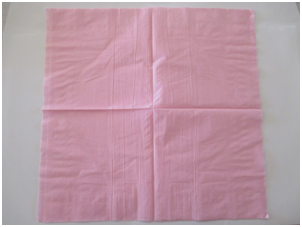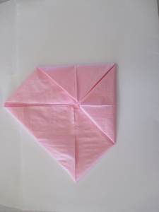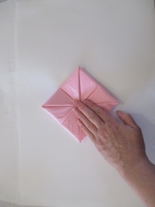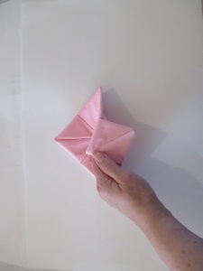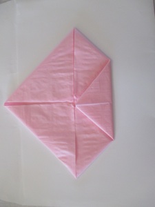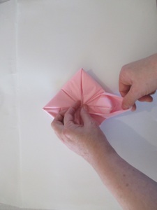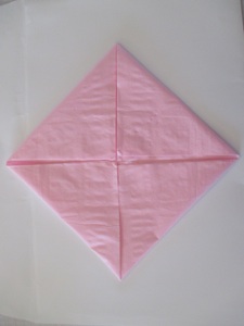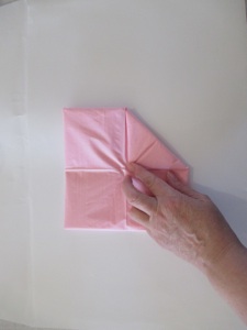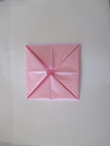 Make a napkin into a waterlily by opening it up to it’s full size, then fold each corner into the middle. Note: if you do not have colored napkins, stack 2 sheets of colored tissue paper for each flower so you can have layers of petals. Cut the paper into 30 cm. squares.