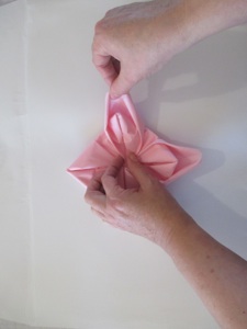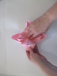 Finally, between each of the petals, reach underneath and pull the corners to the top to form more petals. Hold the center down with your other hand to keep the flower’s shape as you do this.