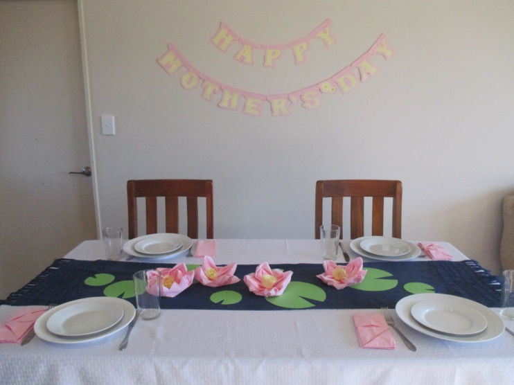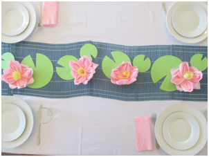 This pretty waterlily centerpiece is perfect for Mothers Day, and the best part is that only costs pennies to make. See step by step instructions for napkin folding below. You can also make the “Happy Mother’s Day” banner, and use it again every year. Party stores seem to sell banners for every occasion except for Mother’s Day! But now you can make one to decorate for Mother’s Day!