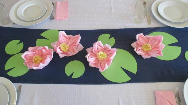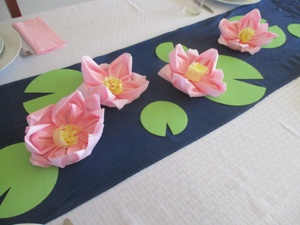 Once you get the hang of folding the napkins, it doesn’t take that long to fold, so you could even fold one for each place setting. If that sounds like too much work, then just fold the flowers for the centerpiece. Even so, it probably takes less time to fold the napkins and cut the lily pads, than to go out and buy a bouquet of fresh flowers. And for sure, this costs a lot less!!