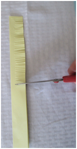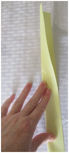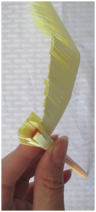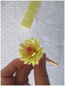 Optional step to make them look even more like waterlilies: Add yellow centers to the flowers. Cut a strip of yellow paper a couple of inches wide, the length of the paper. Fold it in half the long way so it is about an inch wide. Cut slits on the cut side, not the folded side. Wrap the paper around a pencil and splay the strips out with your fingers. Slide it off the pencil and drop it into the middle of a lotus flower napkin. If you want to keep a tight coil, tape the end of the yellow strip before sliding it off the pencil.