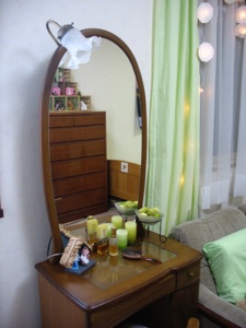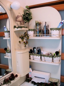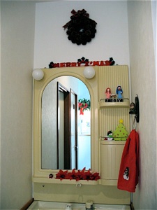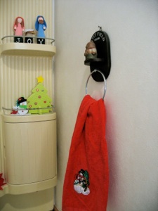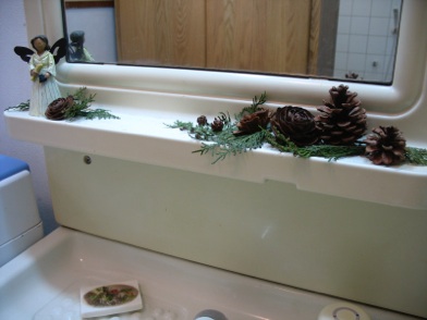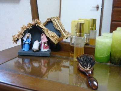 Even if it is not a whole nativity scene, you can sprinkle bits of it around your house, like this angel on the narrow ledge under the mirror.