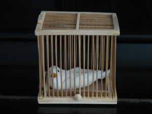 Cleansing of the temple: Any sheep or bird figurine will work for this. The cage shown here is actually an insect cage sold at hundred yen stores in the summer. This dove was sold in the wedding section of a craft store. A dove wouldn’t be too hard to make out of a clay such as Hearty.