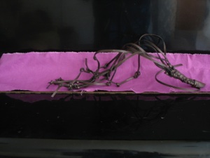 Jesus’ trial: A whip is fairly easy to make if you can find an inexpensive braided belt. They used to sell these at 100 yen stores. I cut them in half, unbraid them, then tie knots in each strand. So I was able to make two for a hundred yen.