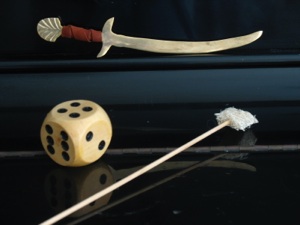 Soldiers cast lots for Jesus’ clothes: dice. If your 100 yen store doesn’t sell these, buy wooden blocks and draw the dots on yourself. You could sand the corners. Jesus offered vinegar to drink: piece of natural sponge on a bamboo skewers. Jesus’ death confirmed: sword. This one is a letter opener I found at a 100 yen store.