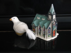 Passover/Holy Spirit descends on disciples/the church begins: There are various symbols that can be used for this. Since tongues of flame were on the disciple’s heads, a candle may be the most appropriate way to depict this. A dove is shown here, since a dove represented the Holy Spirit descending on Jesus at his baptism. This dove was purchased at a craft store in the wedding section. A ceramic church, purchased at a hundred yen store, represents the birth of the church.