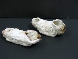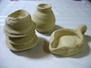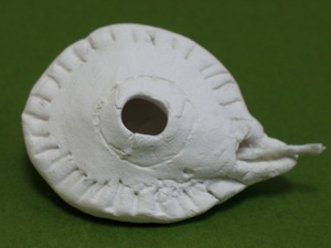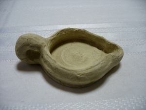 The oil lamp shown above was made by an adult on the potter’s wheel. Once the bowl shape was made, and the wheel was turned off, the right side was pinched for the wick, and the handle was made from a short snake shape, and pressed onto the bowl.