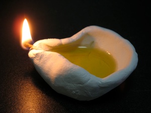 Make an oil lamp out of air drying modeling clay (kaminendo). If there is a kiln in your area that will fire small projects for a reasonable price, you can use real clay. Otherwise, stick to the kind that air-dries or bakes in a standard kitchen oven. Olive oil burns very well with wicks from old candle stubs that you can pull out with pliers before you throw the stubs away--the wicks can be as short as one inch ( 2 cm.). Or buy wick at a craft store and cut it into one or two inch lengths for each child. Let them get the oil once they go home. The easiest way to form the lamp is to make a ball, flatten it into a circle, then pinch one side to make the place for the wick to burn. An alternative way to shape it is to roll the clay into a long snake, and coil it from the center into a circle, and then a bowl shape. Rub the inside and outside with your fingers or a rubber spatula to smooth all the coils together, otherwise if a hole remains, you could end up with a leak--not a happy thing when oil is involved!! Pinch one side for the place where the wick goes. Let it air dry, or bake in the oven according to package instructions.