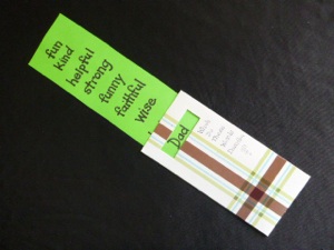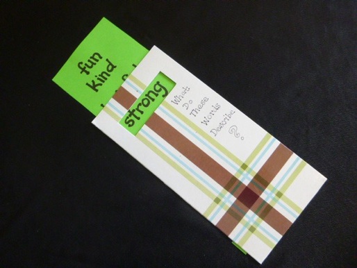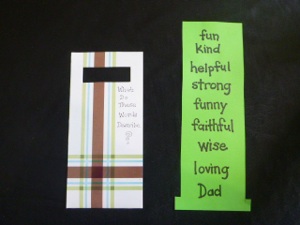 Write the first word to describe Dad in the window. Pull up the inner sheet so that the word doesn’t show in the window anymore, and write the next word in the blank space.