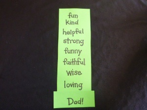 Password is an old-fashioned game that you try to guess a word by using one word synonyms as clues. Use that idea to make a card with words that describe Dad.
