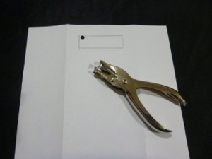 Open it back up so it is flat, and cut a window toward the top of the middle section of the sheet of paper. A box cutter or craft knife is an easy way to do this. Be sure to use a cutting board or two or more thick sheets of cardboard underneath so you don’t cut your table top. If you are cutting them out for a class, cut 3-4 at a time to save time. Another way to cut out the window is to draw the window, and cut a hole with a hole punch inside the window. Use scissors to cut out the window.